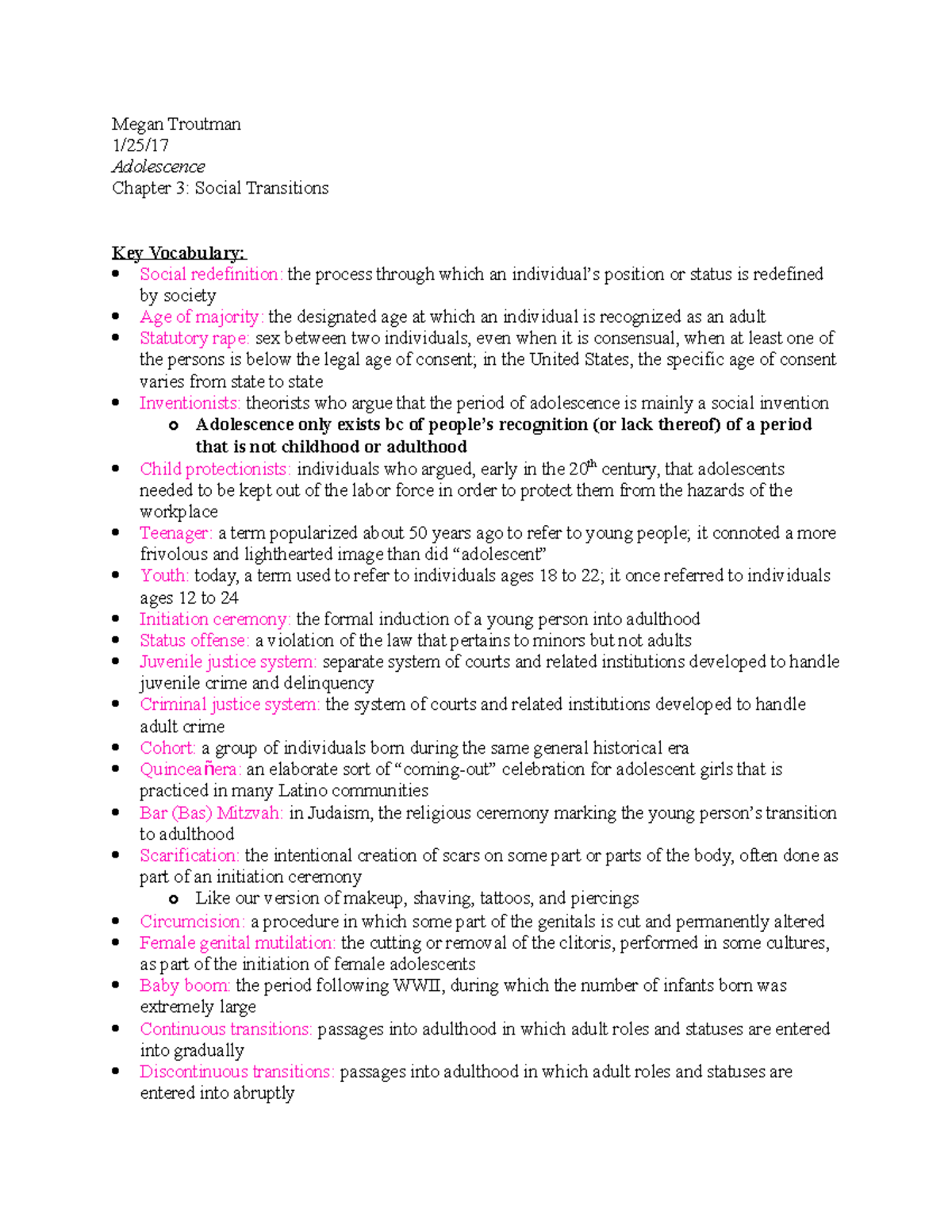 Chapter 3 Summary Adolescence Megan Troutman 1 25 Adolescence Chapter 3 Social Transitions Key Studocu